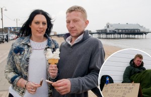Женщина находит свою половинку после остановки, чтобы поговорить с бездомным мужчиной на пляже